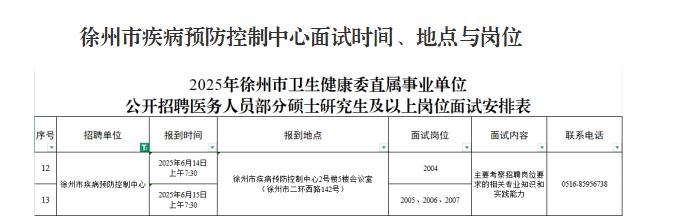 根据《2025年徐州市事业单位公开招聘医务人员公告》要求,现将徐州市卫生健康委直属事业单位公开招聘医务人员硕士研究生及以上岗位面试有关事项通知如下: