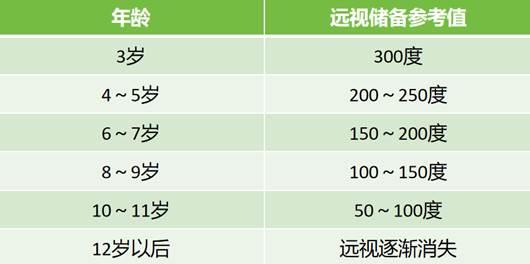 一般情况,3岁左右的儿童,远视为300度;4~5岁,远视储备在200~250度;6~7岁150~200度;8~9岁100~150度,10~11岁50~100度,12岁以后远视逐渐消失。
