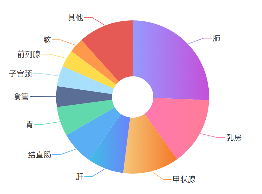 发病前十位的恶性肿瘤为:肺癌、乳腺癌、甲状腺癌、肝癌、结直肠癌、胃癌、食管癌、子宫颈癌、前列腺癌、脑癌,占全部新发肿瘤的