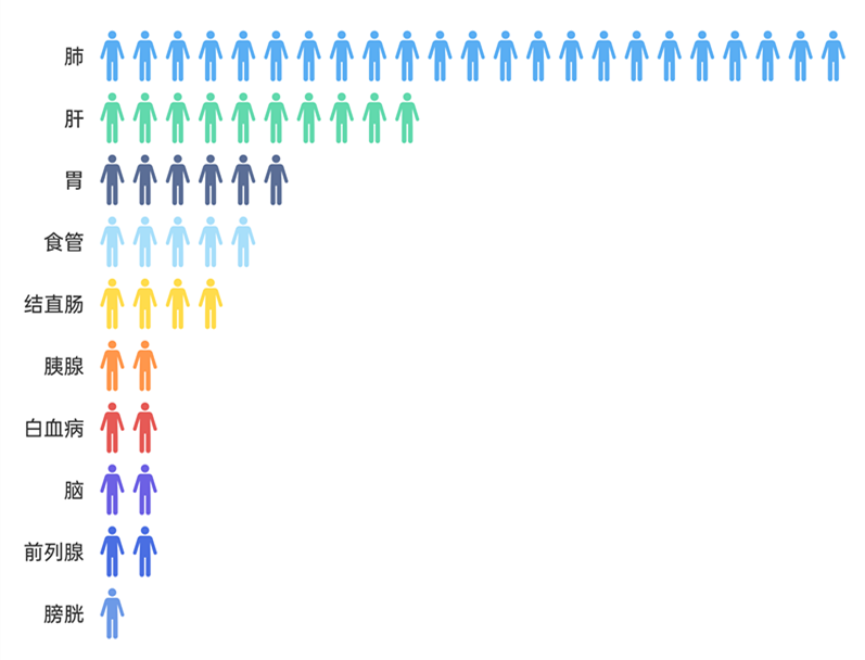 死亡前十位的恶性肿瘤为:肺癌、肝癌、胃癌、食管癌、结直肠癌、乳腺癌、胰腺癌、前列腺癌、白血病、脑癌,占恶性肿瘤死亡总数的