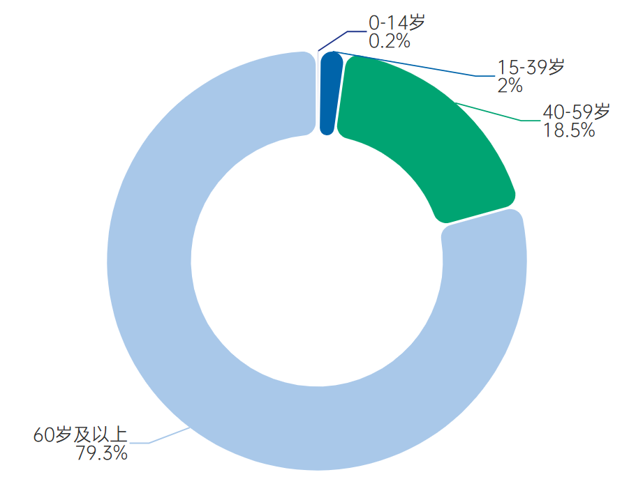 按年龄段统计,0-14岁儿童、15-39岁青(少)年、40-59岁中年人、60岁及以上老年人的恶性肿瘤死亡例数分别占全市癌症总死亡例数的0.2%、2.0%、18.5%和79.3%。
