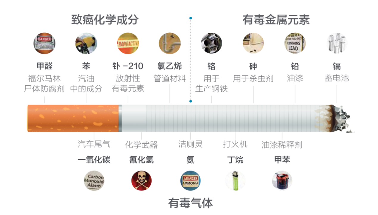 至少包括 69 种已知的致癌物。这些致癌物会引发机体内关键基因突变,正常生长控制机制失调,最终导致细胞癌变和恶性肿瘤的发生