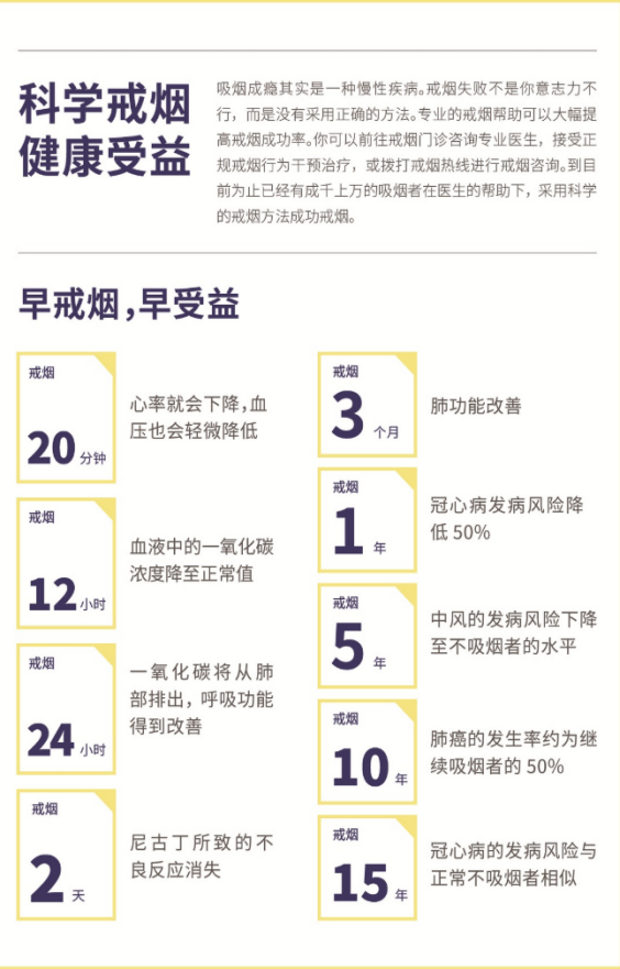 戒烟越早越好。任何年龄戒烟均可获得巨大的健康益处,包括降低癌症等吸烟相关疾病的发病及死亡风险,并改善相关疾病预后,延长寿命等。
