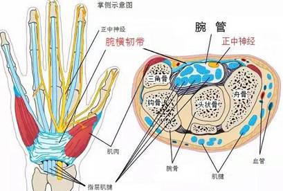 手及腕部长时间从事重复作业或用力作业后,引起手部正中神经支配区域出现感觉或运动障碍。