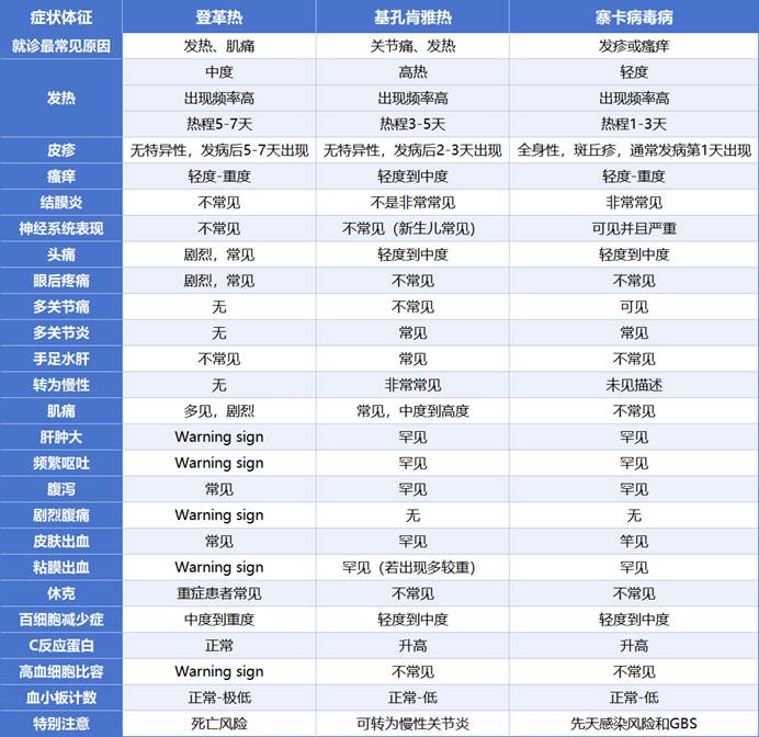 三种疾病临床表现非常相似,但各有不同特点,下面一张图展示了三种疾病的常见表现。