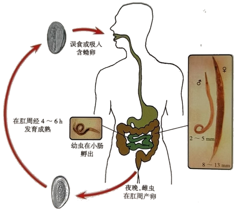 少数雌虫在肛门产卵,幼虫经肛门逆行进入肠道后,约15到30天发育为成虫并产卵。