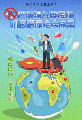 海报彰显我国在消除本土疟疾传染源方面取得的成就,又强调在全球人员往来中保持防控警惕的重要性,呼吁全民共同筑牢输入性疟疾防线,守护来之不易的公共卫生成果。