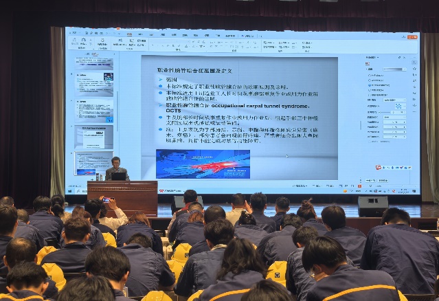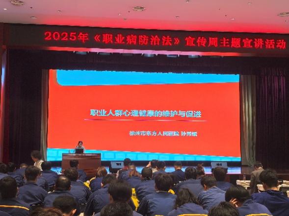 在徐州重型机械有限公司,疾控专家围绕“新版《职业病分类和目录》”及“职业健康素养提升”等主题开展专题宣讲,并发放《用人单位职业病防治主要责任告知书》、职业病防治手册与宣传品。同时,徐州东方医院心理专家就心理健康知识进行讲解。